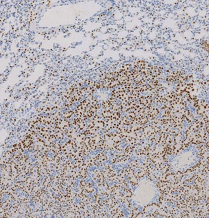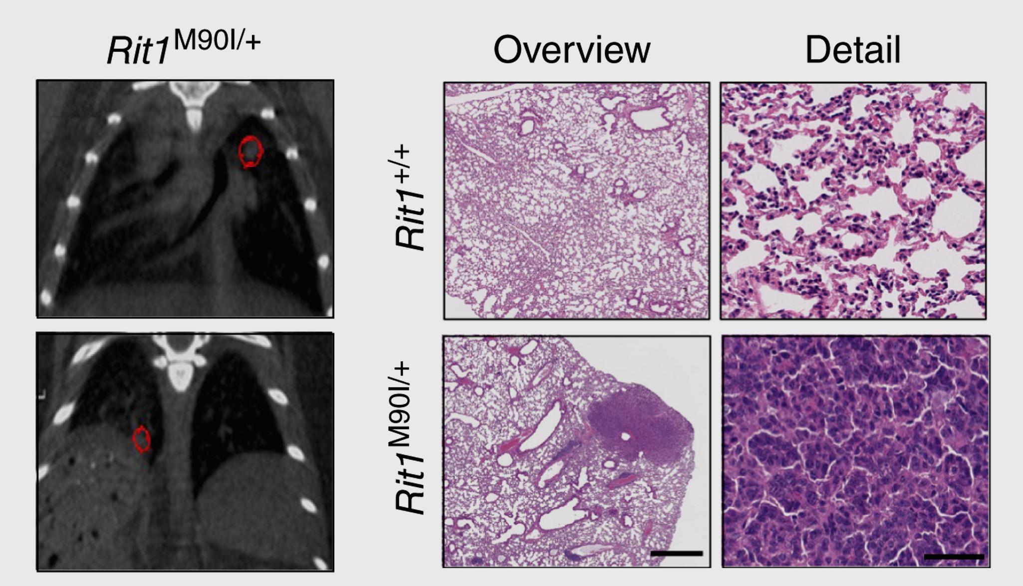 Using a knock-in mouse model that expresses a RIT1 pathogenic variant, we have established mouse models for a rare subtype of lung adenocarcinoma (shown here by µCT and histology) and Noonan syndrome.