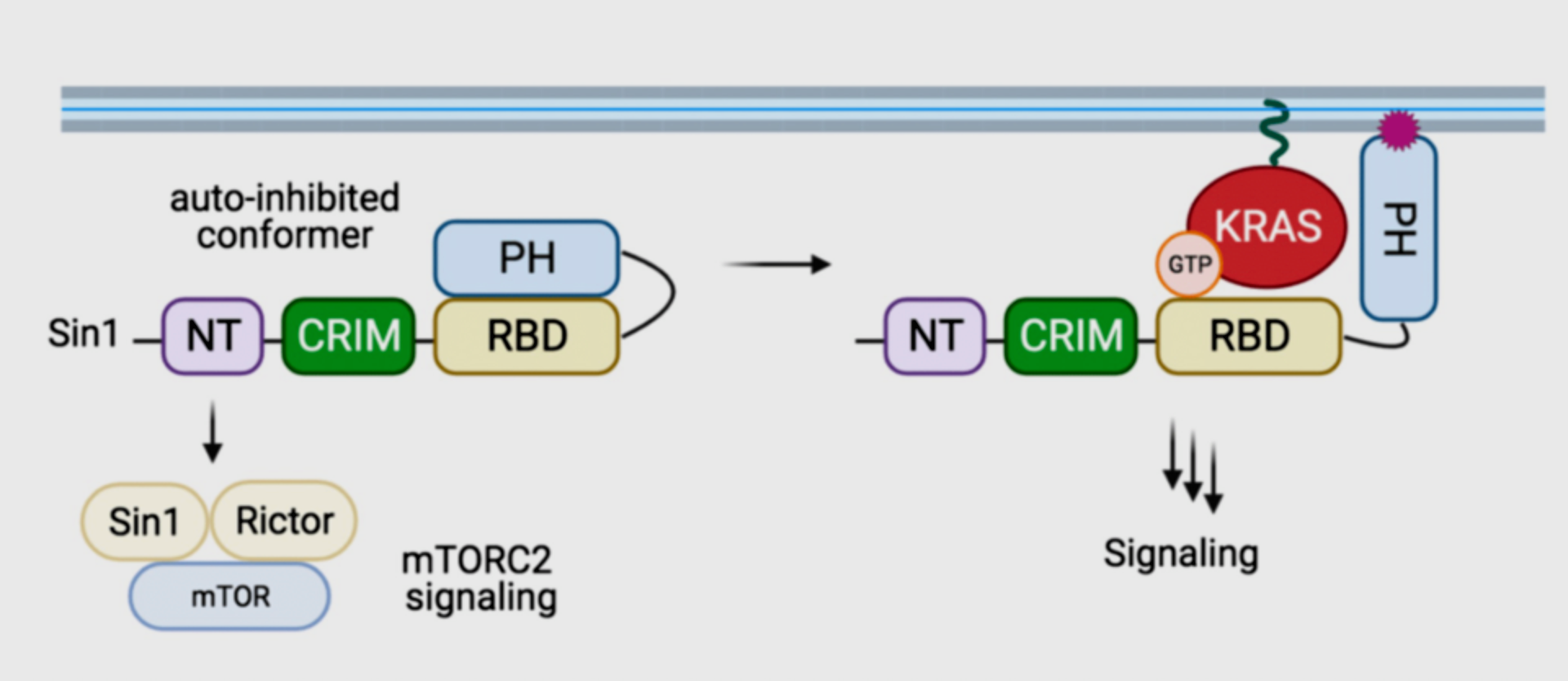 Proposed model of Sin1 function. In the autoinhibited conformation, Sin1 is unable to bind to KRAS, but can participate as a component of mTORC2. In the open conformation, Sin1 is able to bind KRAS-GTP, but the signaling downstream of this GTPase remain unknown.
