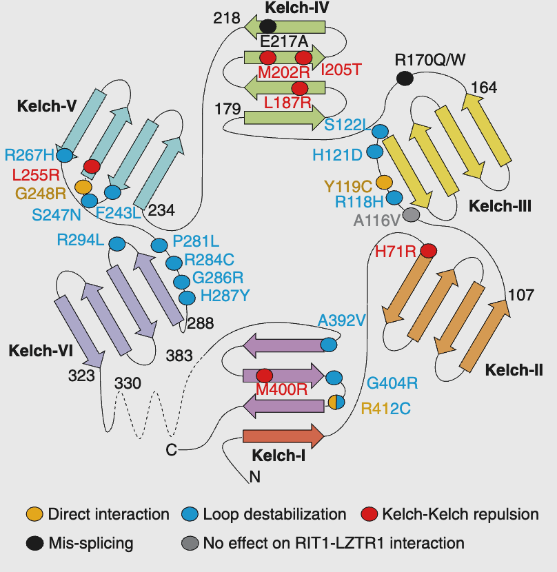 Recently, in collaboration with Dr. Simanshu’s group at NCI, we have uncovered the structural mechanisms that explain why certain mutations on the Kelch domain fail to recognize RIT1, leading to its accumulation in the cell as a result of defective degradation. LZTR1 also contains two C-terminal BTB-BACK domains, which function as a dimerization platform and region of Cullin 3 interaction.